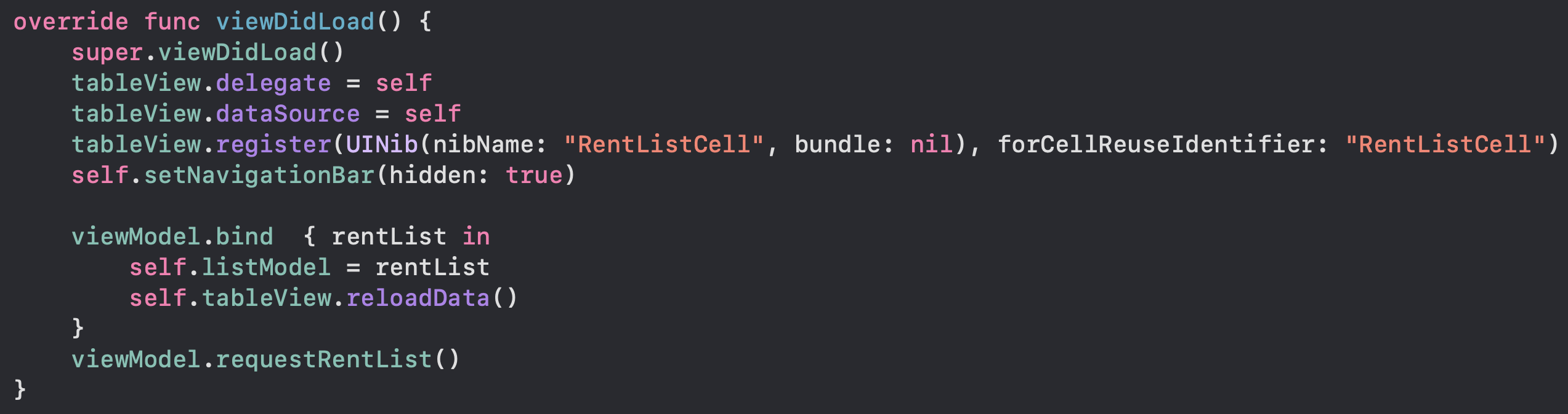viewModel의 bind 메서드를 통해 completionHandler를 바인딩하고 requestRentList 메서드를 호출했습니다.