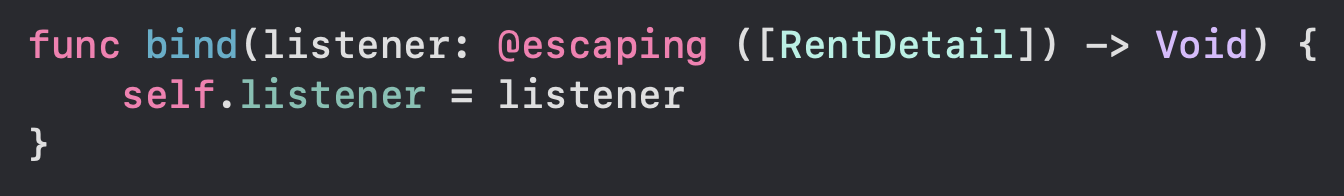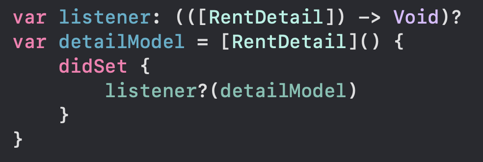 viewModel에는 api 요청을 통해 rentList를 받아오면 실행할 클로저를 담을 변수인 listener가 있고 detailModel에 값이 할당되면 listener를 호출하게 되어 있습니다.