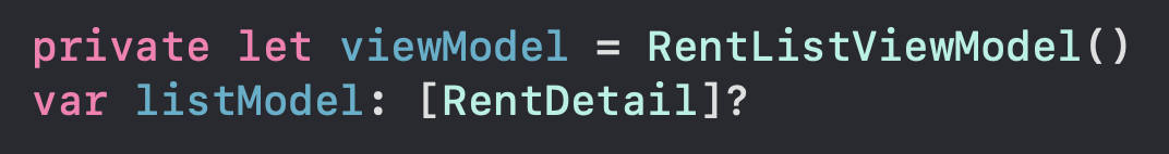 View의 역할을 담당할 RentListViewController 클래스를 만들고 그 안에 viewModel과 리스트에 뿌려줄 데이터를 담을 배열을 선언했습니다.