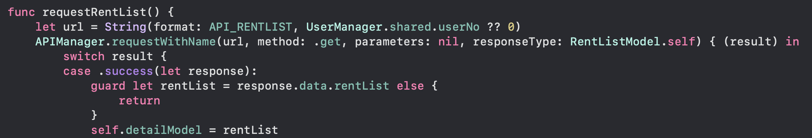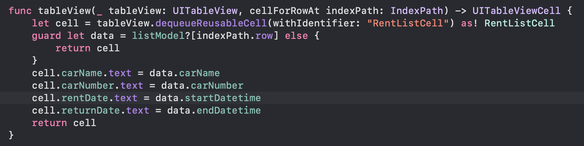 requestRentList에서 api 요청 후 success가 떨어지면 detailModel에 response값이 할당되고 프로퍼티 옵저버에 의해 listener가 실행되며 View에 선언된 listModel에 값이 할당되고 tableView가 reload 됩니다.