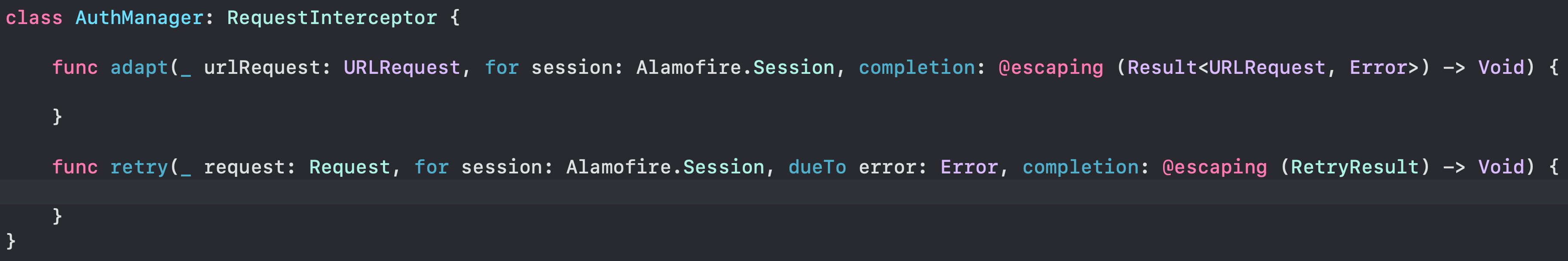 일단 RequestInterceptor 프로토콜을 채택한 클래스와 메서드를 만들어줍니다.