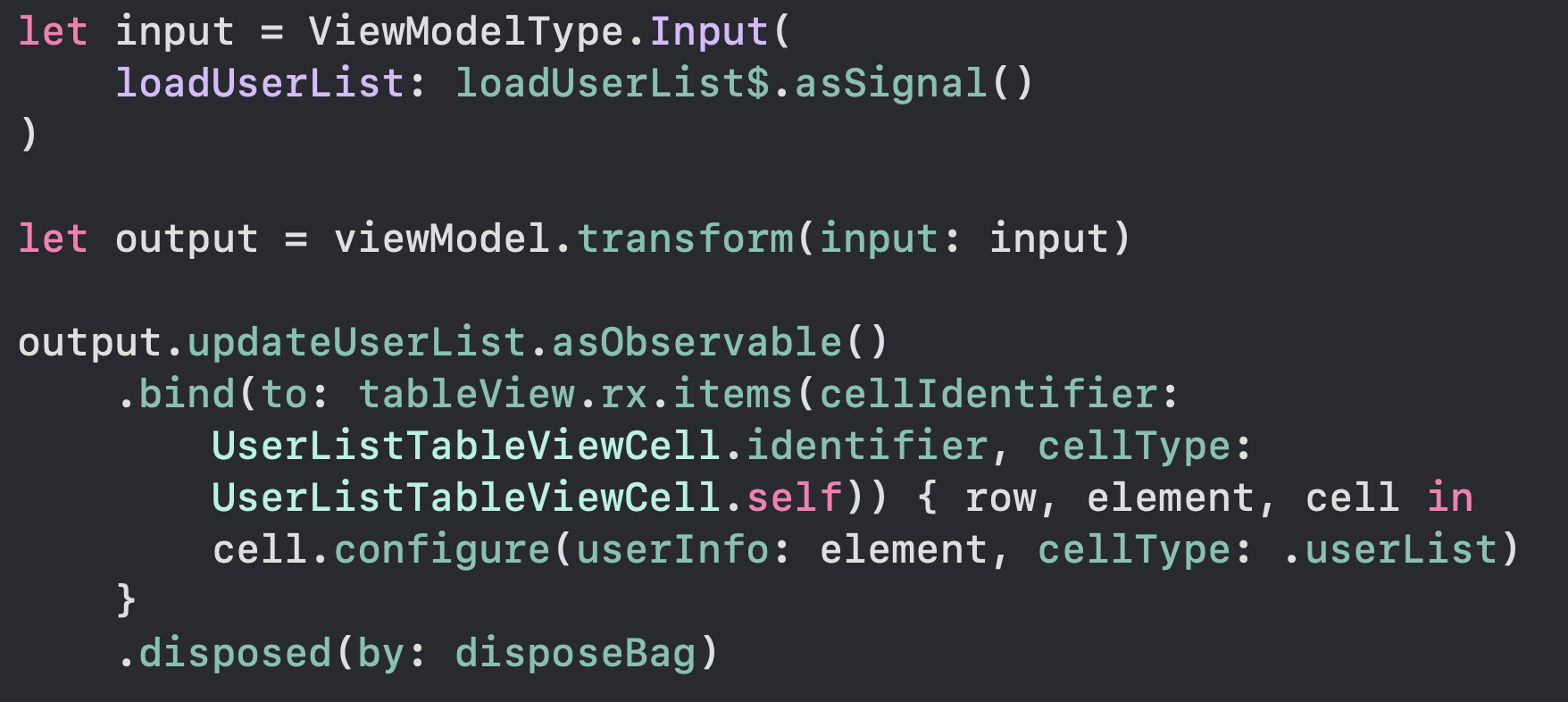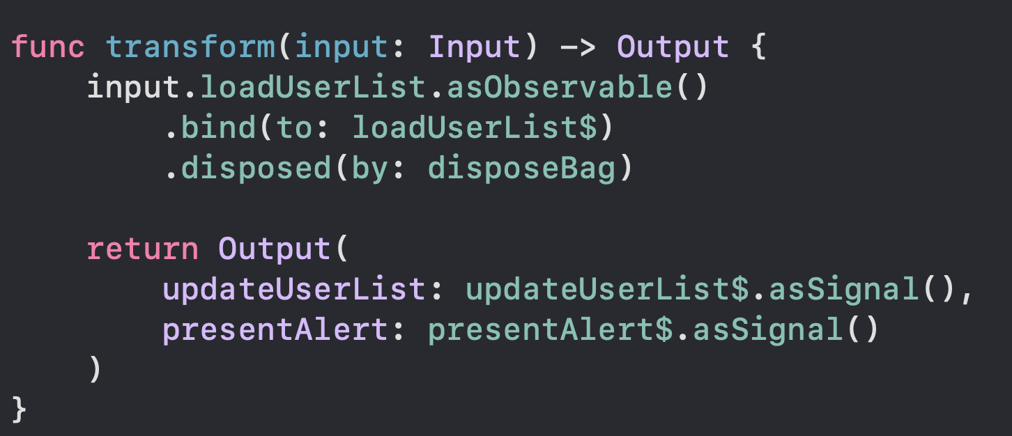 이렇게 구조체를 정의하는 이유는 transform이라는 메서드를 통해 Input과 Output의 Signal을 한 번에 전달하여 View는 ViewModel의 Output의 Signal에, ViewModel은 View의 Input의 Sginal에 바인딩하여 필요한 동작을 정의하기 위해서입니다.