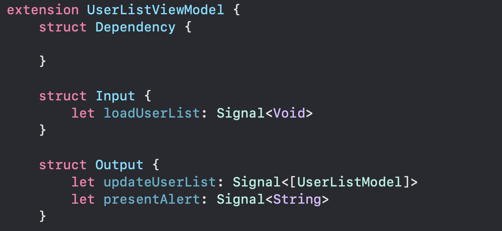 기본적인 구조로는 ViewModel 클래스에서 Dependency, Input, Output 구조체를 정의하여 초기화 시 받을 데이터(Dependency), View에서 받을 이벤트(Input), 비즈니스 로직을 처리한 후 View에 넘겨줄 데이터(Output)의 구조를 정의합니다.